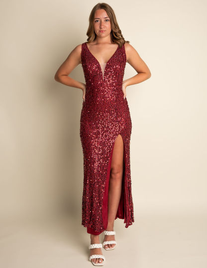 Sheath Burgundy Sequin Deep V-Neck Bridesmaid Dress With Slit #RJBM018
